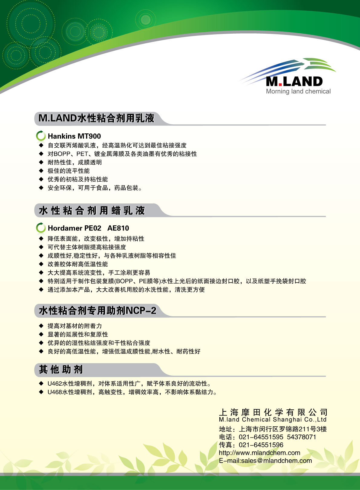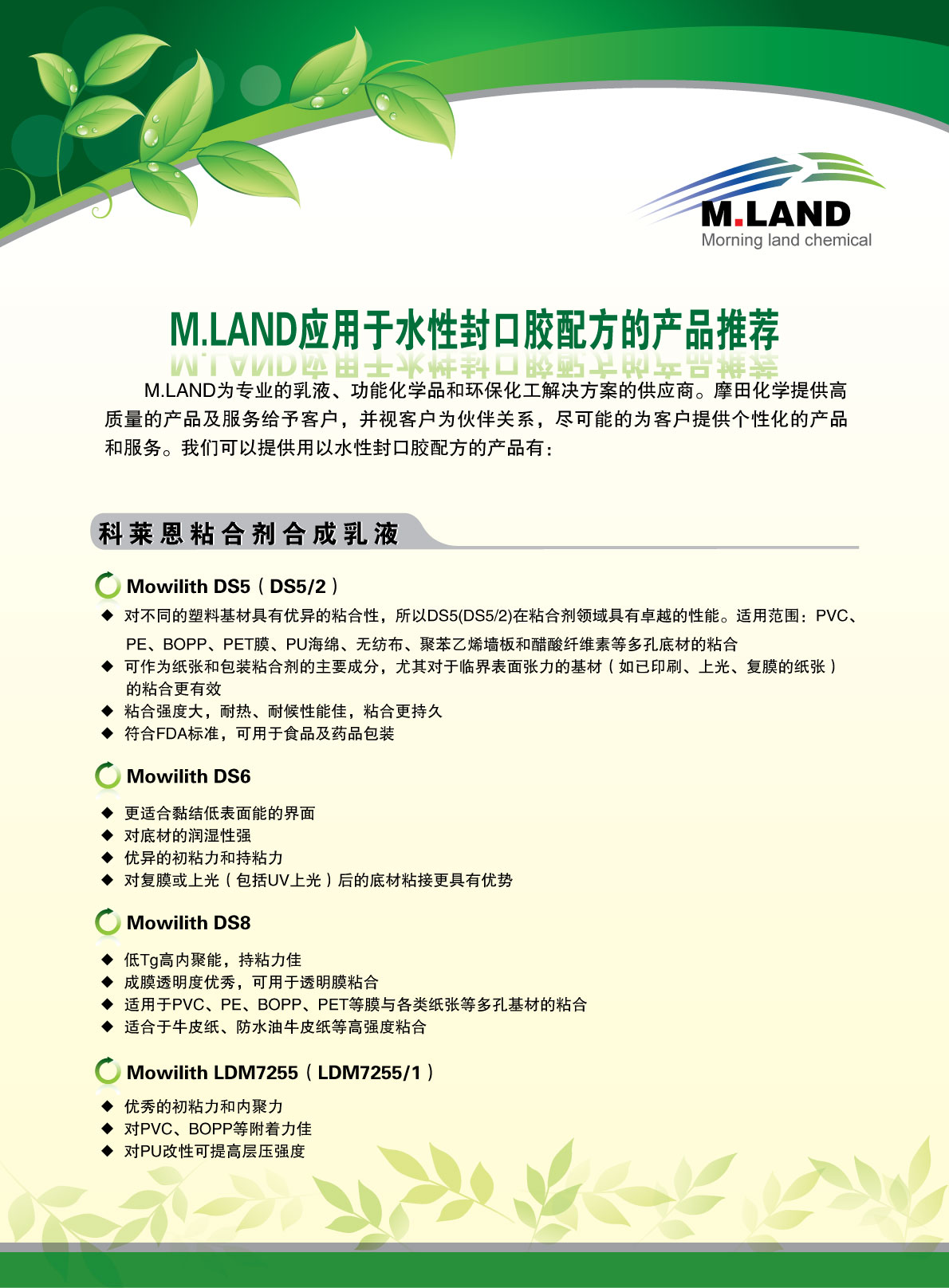 | 2015年胶粘剂展摩田化学海报 | 中国胶粘剂行业领先的原材料及解决方案供应商,摩田化学将于2015年9月16日~18日如期亮相上海世博展览馆。本次展会讲集中展示摩田化学近期在新材料研发和应用上取得的一些有代表性成果的产品及解决方案: 1、互穿网络聚合物乳液:实现水性产品的快速定位。 2、乙烯-醋酸乙烯-马来酸酐三元共聚乳液:创新一代的新型多功能粘合剂用聚合物合成乳液,为胶粘剂配方设计提供又一推动力。 3、单分散聚合物纳米分散体:为乳液聚合工业及新工艺的开发应用提供了创造性革新。 4、针对难粘基材的附着力促进剂:有效解决低表面能材料难附着问题。 5、低表面能材… | 0.95M | 2015-07-14 | 2767 | ![]() |